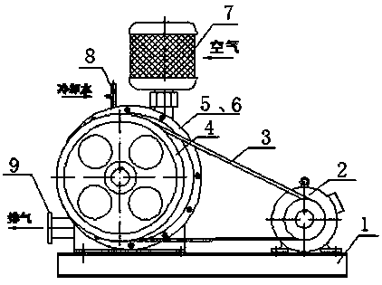2)降低制造成本,本實(shí)用新型可節(jié)省零部件:1個(gè)油水分離罐;1個(gè)通常嵌焊于底座內(nèi)的貯油箱;1 套回油管路;同時(shí),風(fēng)鼓內(nèi)部不需加工進(jìn)風(fēng)槽,可用無(wú)縫鋼管焊制風(fēng)鼓,風(fēng)鼓的制造材料節(jié)省40%,加工過(guò)程更簡(jiǎn)單,因此,本實(shí)用新型的總制造費(fèi)用比同型號(hào)傳統(tǒng)回轉(zhuǎn)鼓風(fēng)機(jī)節(jié)約8~10%;