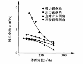 因為漩渦風機流量大,側流道氣體的速度就大,湍流強度就大,造成沖擊損失較多,而壓力面倒角雖然從上面理論分析比未倒角能量頭低,但倒角相當于進口集流器.會減少流動的沖擊損失,而流量越大這種損失就越多,